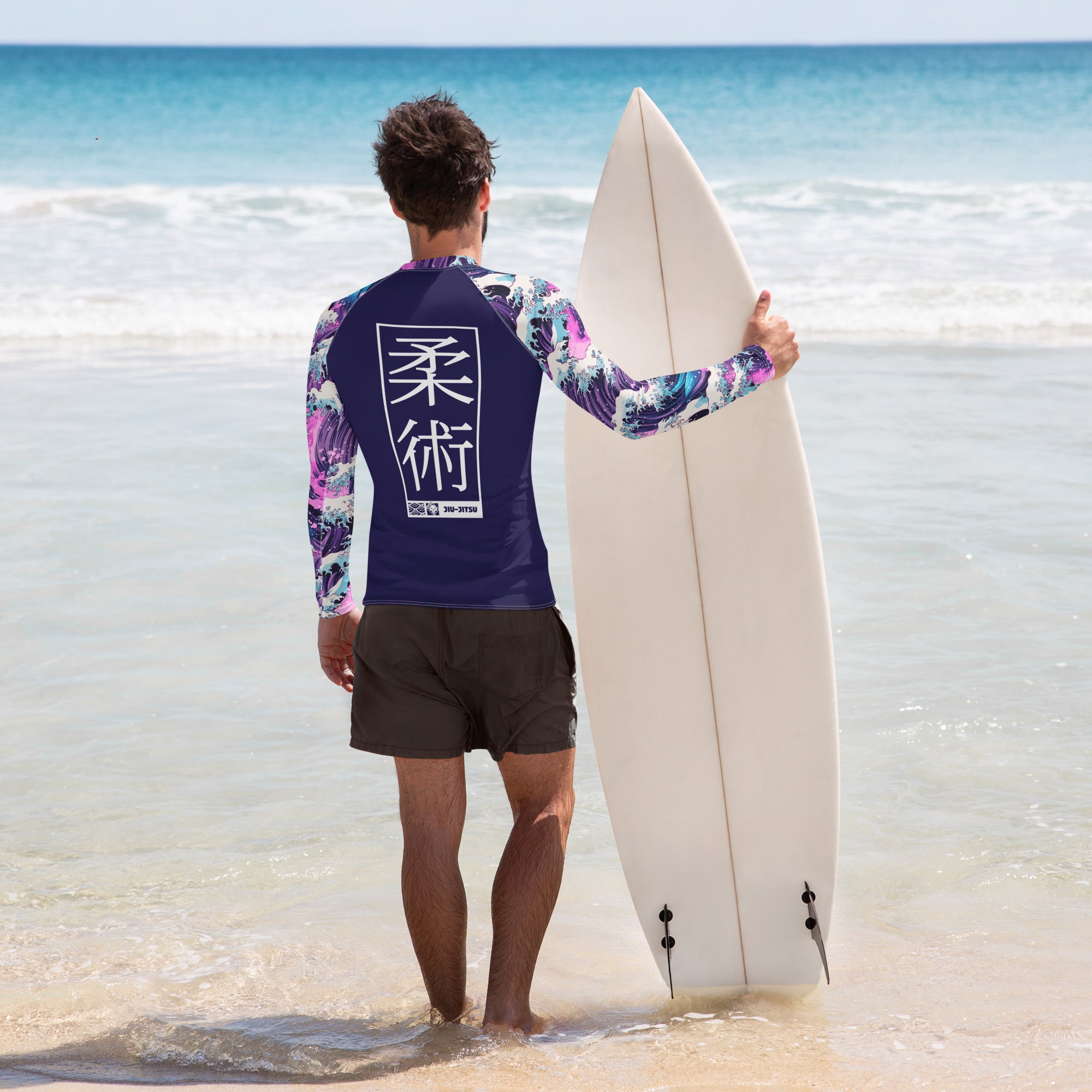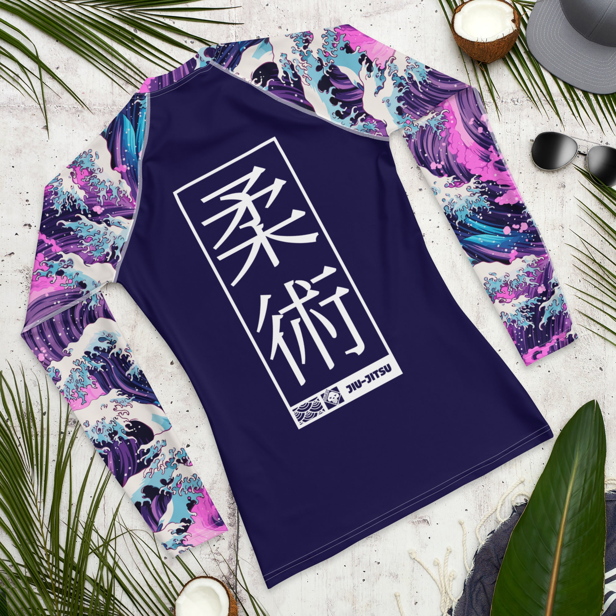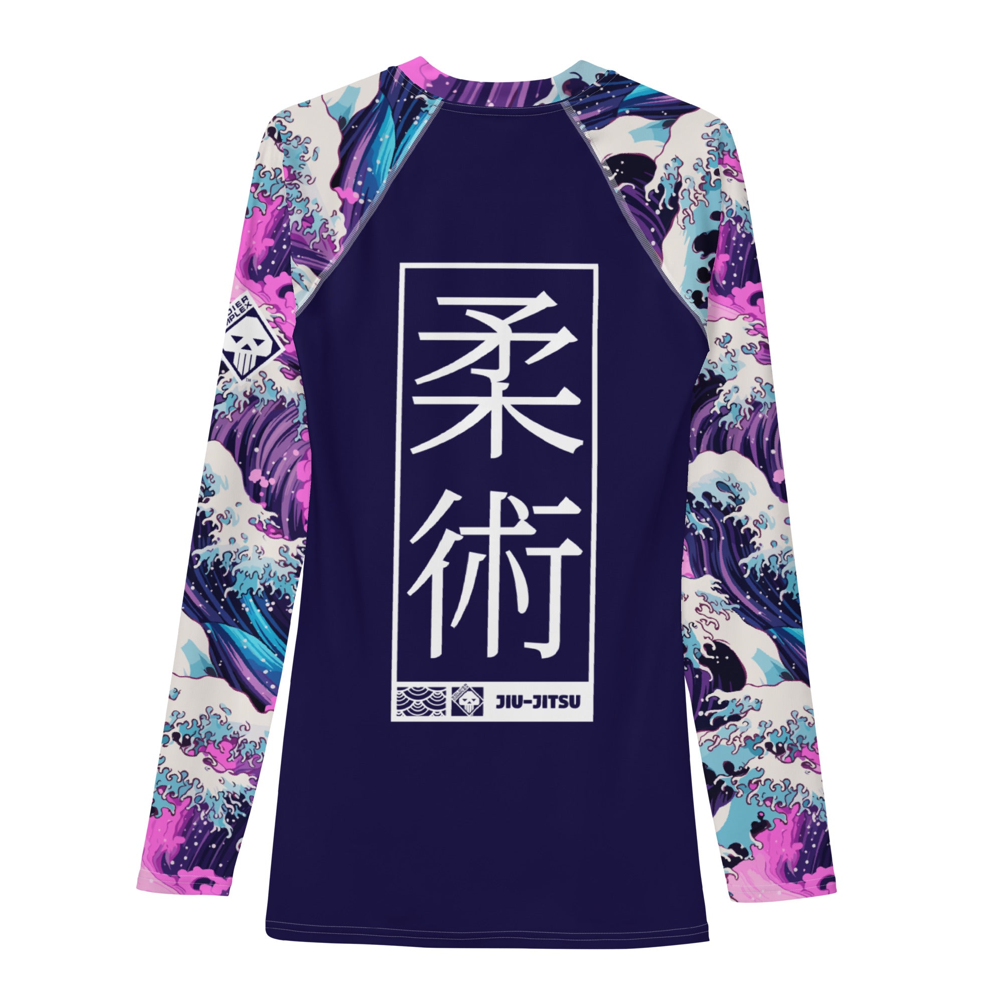 The long‑sleeve rash guard features a sleek, second‑skin compression fit that enhances mobility, muscle support, and endurance during rolls, scrambles, and drilling sessions. Its moisture‑wicking, four‑way stretch fabric keeps you cool under pressure, while reinforced flatlock seams ensure durability and a chafe‑free training experience. The Great Wave and Sakura artwork flows across the torso and sleeves with vivid detail, symbolizing both strength and renewal.